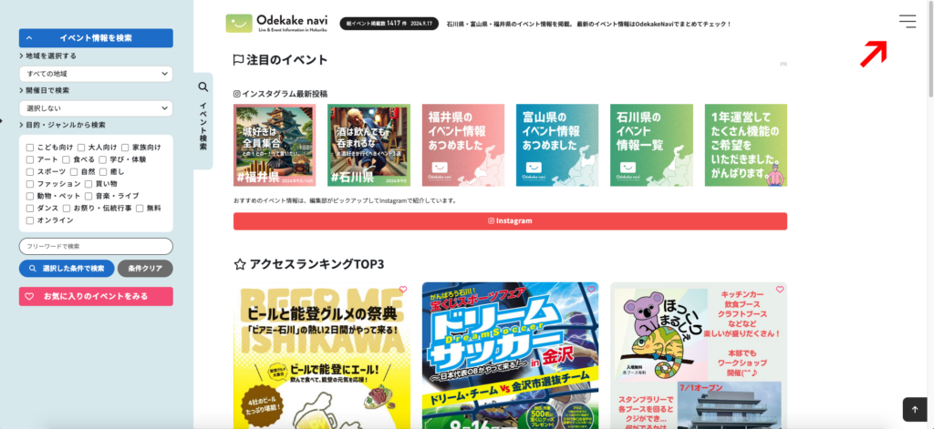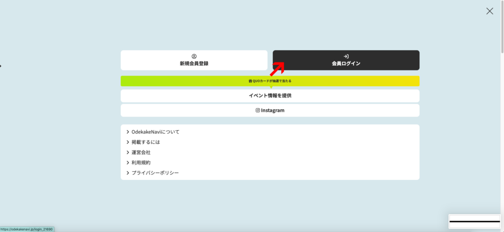 1、OdekakeNaviの右上にあるハンバーガーメニューを開き「会員ログイン」をクリック