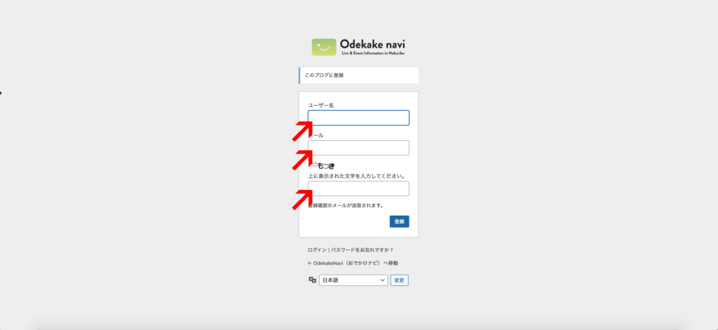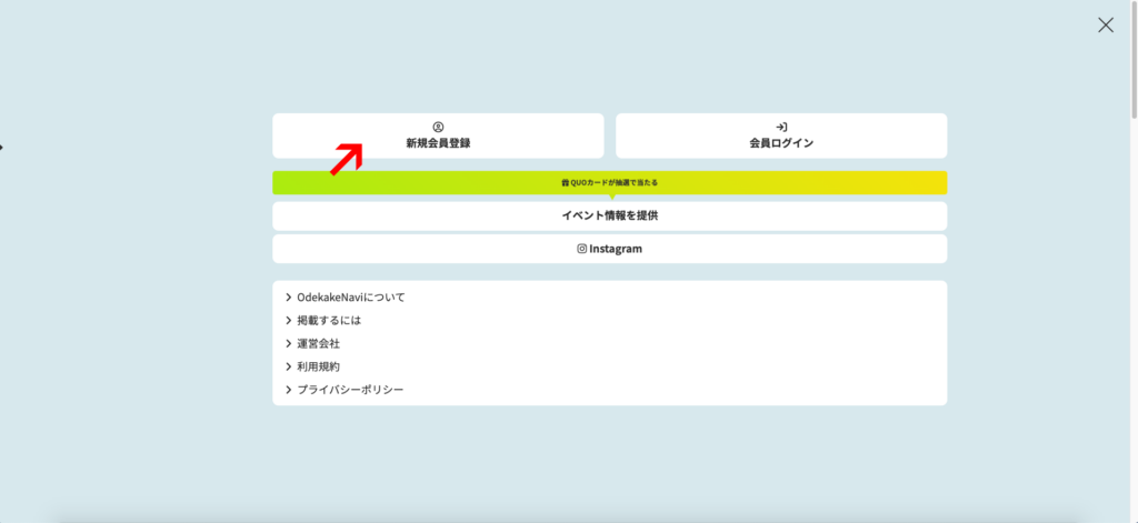 1、OdekakeNaviの右上にあるハンバーガーメニューを開き「新規会員登録」をクリック