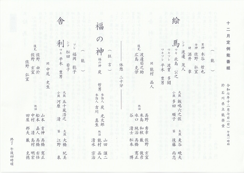 | 出演者 | 能「絵馬」 渡邊茂人 酒井章 佐野弘宜 木谷哲也 北島公之 能村晶人 狂言「福の神」 炭哲男 炭光太郎 吉川真生 能「舎利」 松田若子 福岡聡子 平木豊男 中尾史生 |