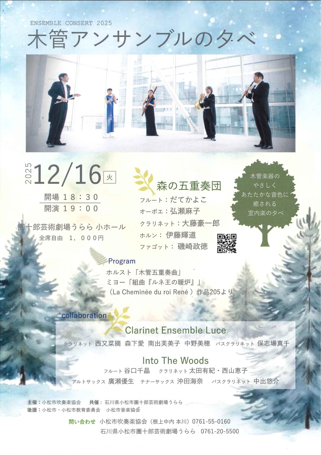 | 出演者 | 森の五重奏団 フルート:だてかよこ オーボエ:弘瀬麻子 クラリネット:大藤豪一郎 ホルン:伊藤輝道 ファゴット:磯崎政徳 collaboration Clarinet Ensemble Luce クラリネット:西又菜摘 森下愛 南出芙美子 中野美穂 バスクラリネット:保志場真千 Into The Woods フルート:谷口千晶 クラリネット:太田有紀 西山恵子 アルトサックス:廣瀬優生 テナーサックス:沖田海奈 バスクラリネット:中出悠介 |