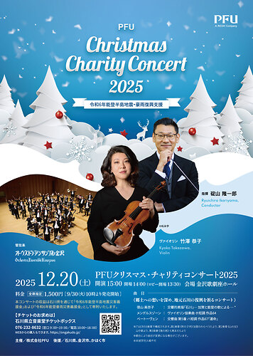 | 価格 | 全席指定席 ¥1,500 本コンサートの収益は石川県を通じて「令和6年能登半島地震災害義援金」および「令和6年能登豪雨災害義援金」として寄附いたします。 |