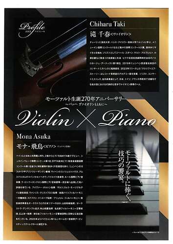 | 詳細 | モーツァルトに捧ぐ、技巧の饗宴。 モーツァルトを深く愛し、その音楽を繊細さと美しさに加え、 技巧をもって奏でるピアニストの一人、モナ・飛鳥氏と 圧倒的な技巧と豊かな音楽性で人々を魅了するヴァイオリニスト・滝千春氏を迎え、 至極の演奏をお楽しみいただきます。 |